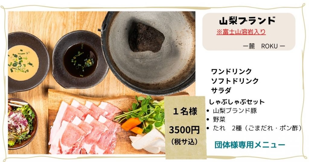 山梨ブランド豚と地元野菜を、富士山溶岩入り鍋で味わう特別なしゃぶしゃぶ。