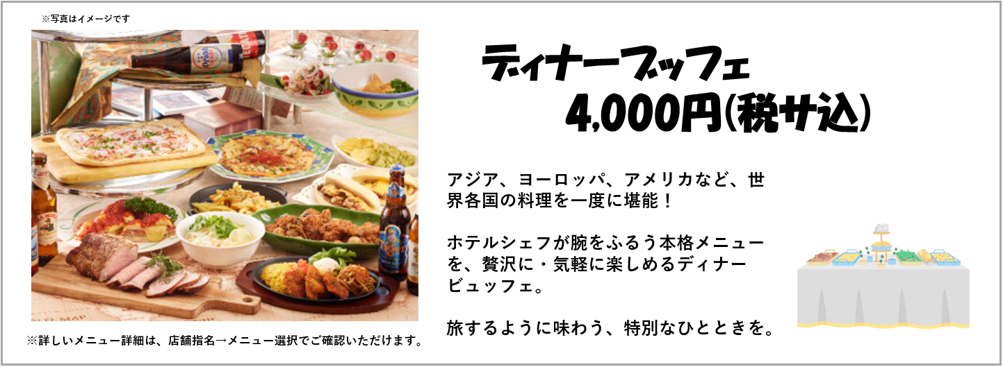 アジア・ヨーロッパ・アメリカなど、旅気分で味わえる多彩な料理をブッフェ形式でご提供します。