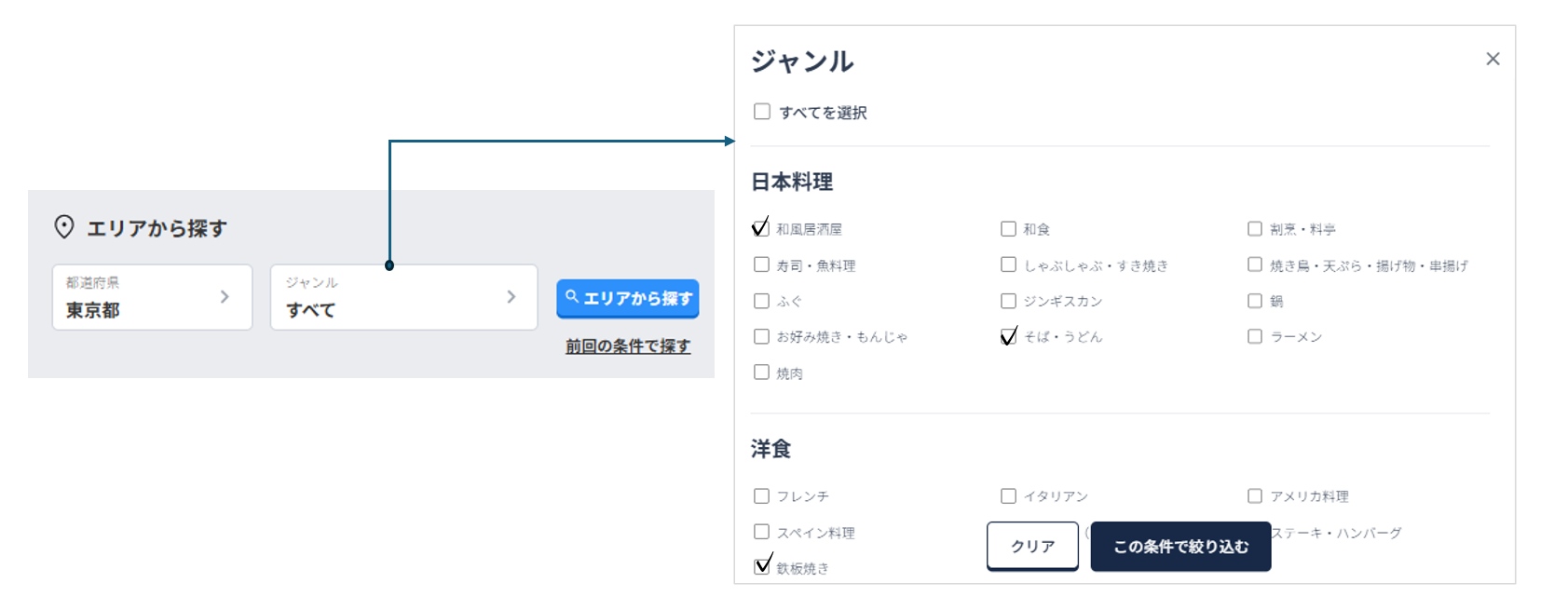 複数ジャンルの選択にも対応し、希望条件に合うお店をよりスムーズに見つけられます。